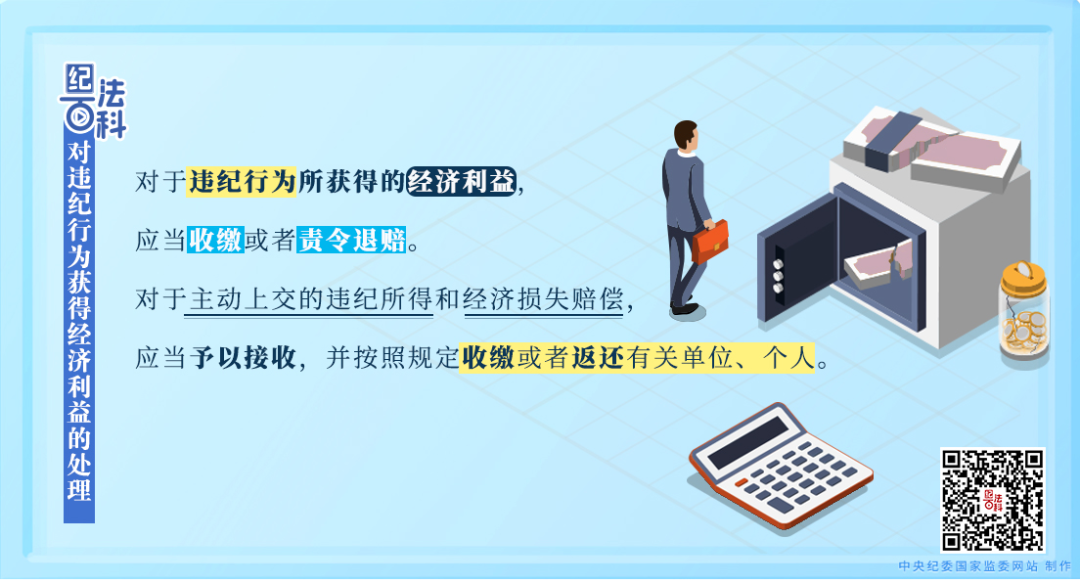 《中国共产党纪律处分条例》第四十三条规定:对于违纪行为所获得的经济利益,应当收缴或者责令退赔。对于主动上交的违纪所得和经济损失赔偿,应当予以接收,并按照规定收缴或者返还有关单位、个人。