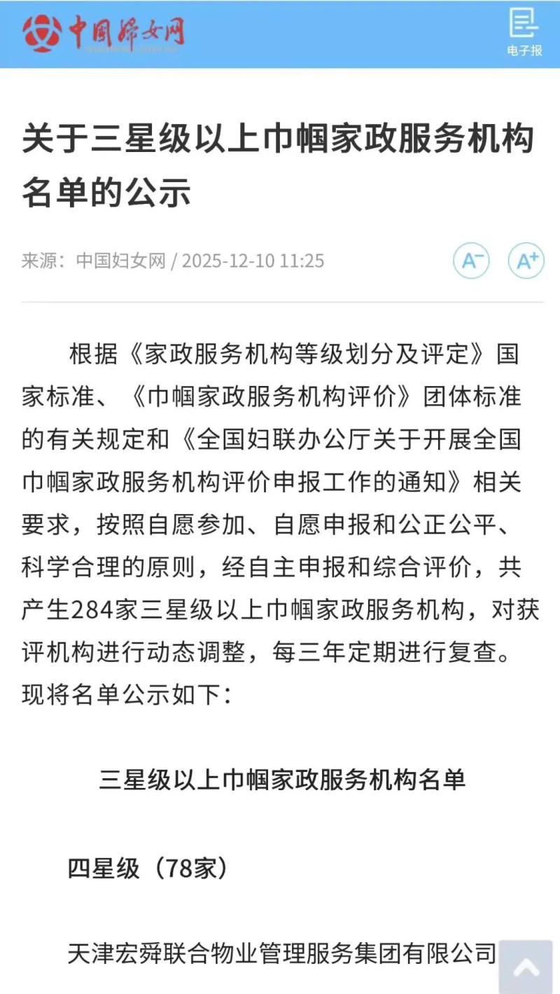 近日,全国妇联办公厅公布了全国巾帼家政服务机构评价结果,桃江县鸿兴家政服务有限公司凭借规范运营、专业服务和在巾帼家政领域的积极作为,经严格审核与综合评定,成功获评全国四星级巾帼家政服务机构。