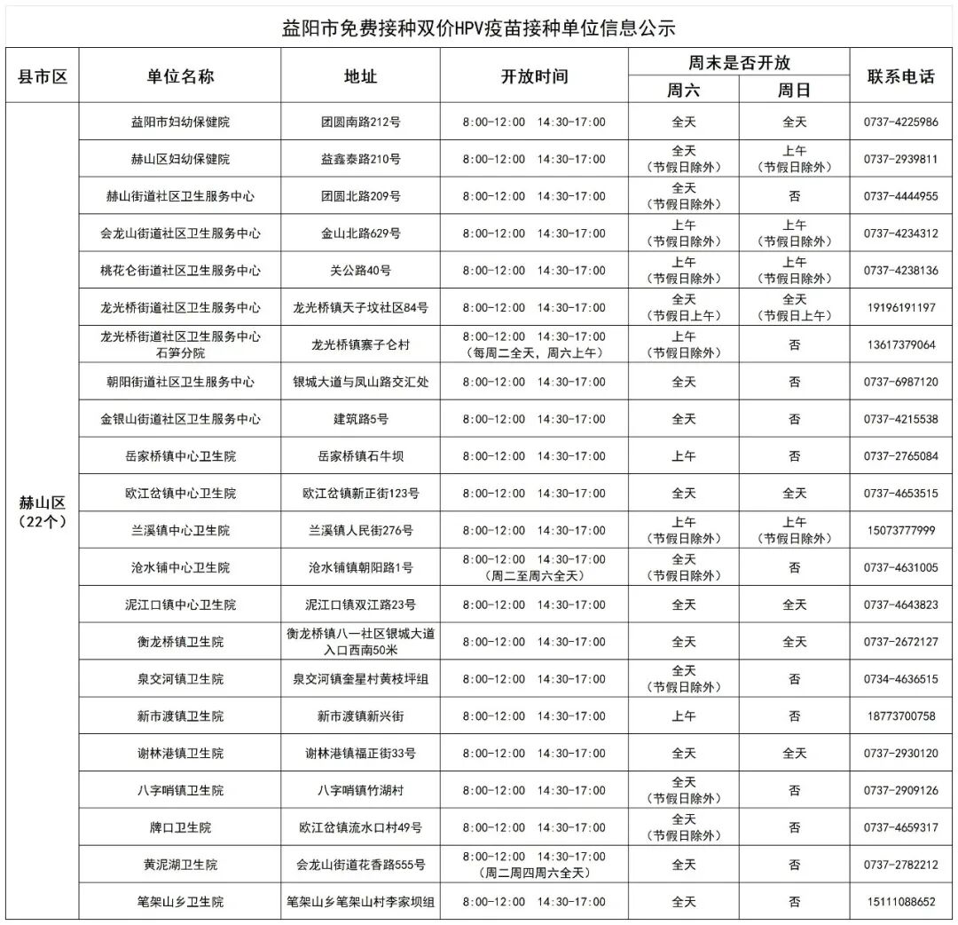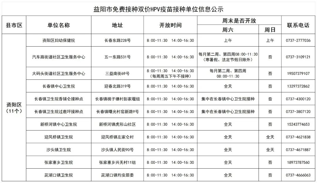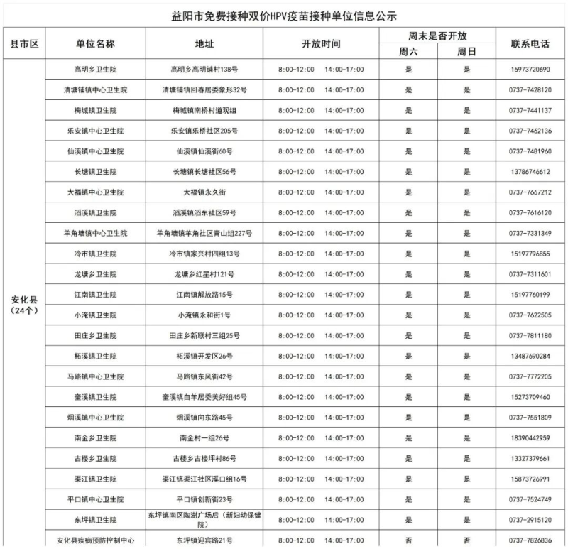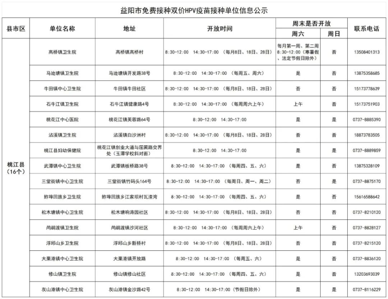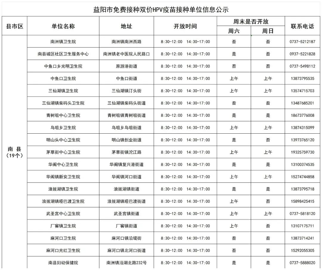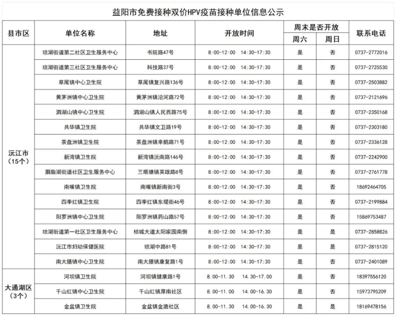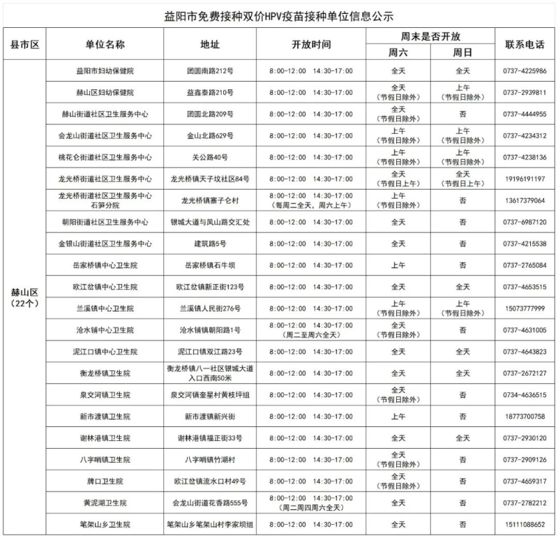 近期,益阳市疾控中心值班电话接受咨询双价HPV疫苗免费接种事宜较多,为方便适龄女孩就近接种双价HPV疫苗,益阳疾控收集了全市能提供国产双价HPV疫苗的接种单位信息,现公示如下: