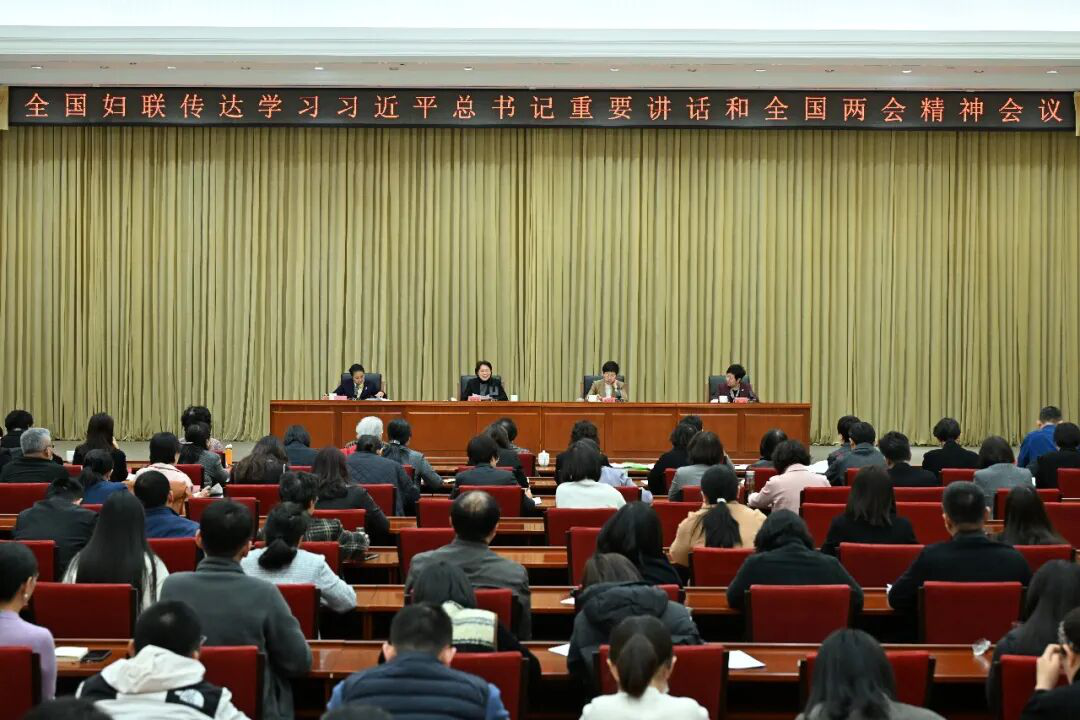 全国妇联副主席、书记处书记章冬梅主持会议。全国人大常委、全国妇联原副主席、书记处书记谭琳,全国政协委员、全国妇联原副主席、书记处书记张晓兰分别传达十四届全国人大四次会议和全国政协十四届四次会议精神。全国妇联党组书记处同志、离退休老同志、各部门处级以上干部、直属单位班子成员等参加会议。