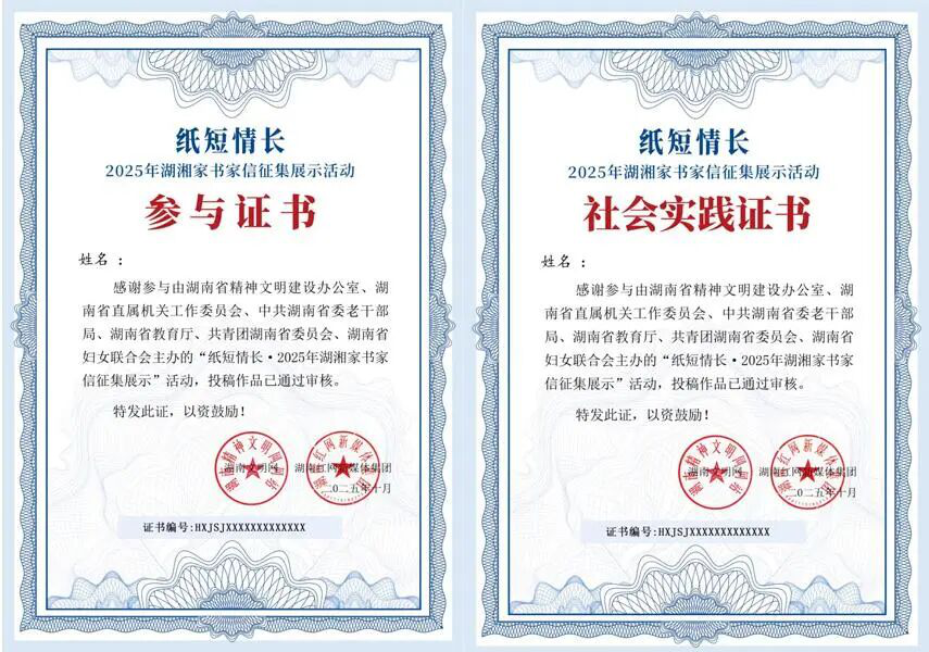 1、符合征集要求的手写/电子家书经审核发布后,参与者登录“文明湖南”微信公众号或红网时刻新闻客户端,领取活动参与电子证书,学生群体可领取省级社会实践活动电子证书。